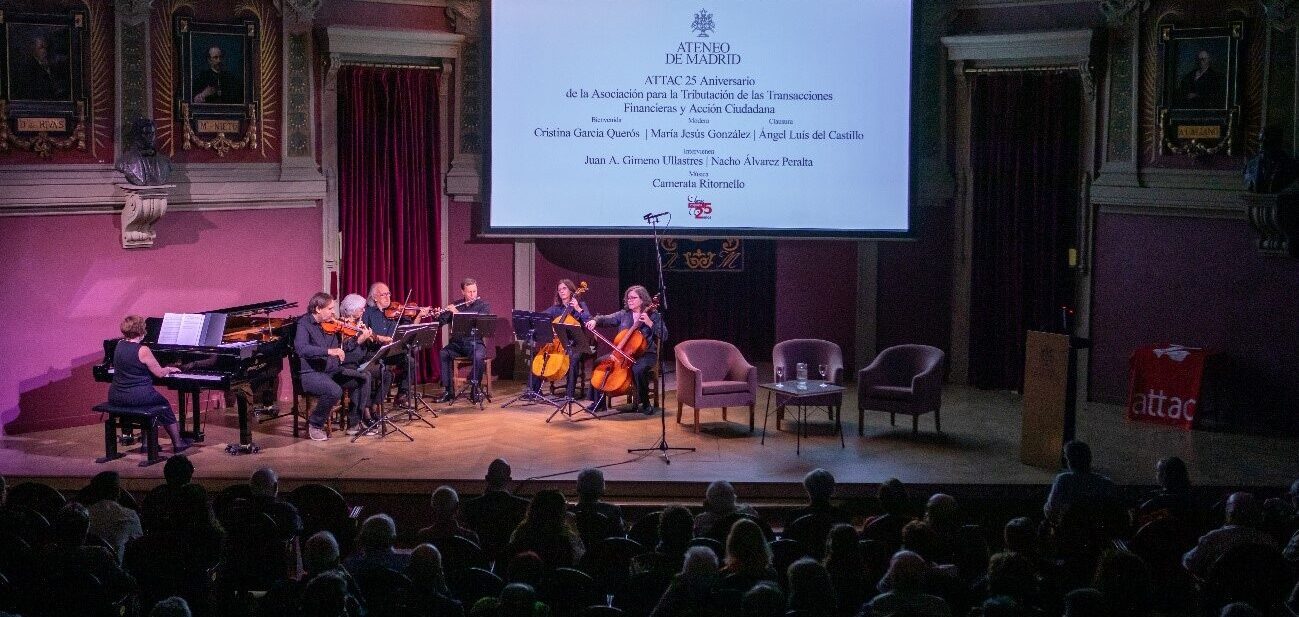 ATTAC España (Asociación por la Tributación de las Transacciones financieras y la Acción Ciudadana) celebró el pasado 20 de Octubre su 25 aniversario con un acto solemne y reflexivo en la Cátedra Mayor del Ateneo de Madrid. La conmemoración sirvió para repasar el cuarto de siglo de trabajo de la Asociación en la búsqueda de alternativas sociales, ecológicas y democráticas frente a la lógica de mercado desregulada.