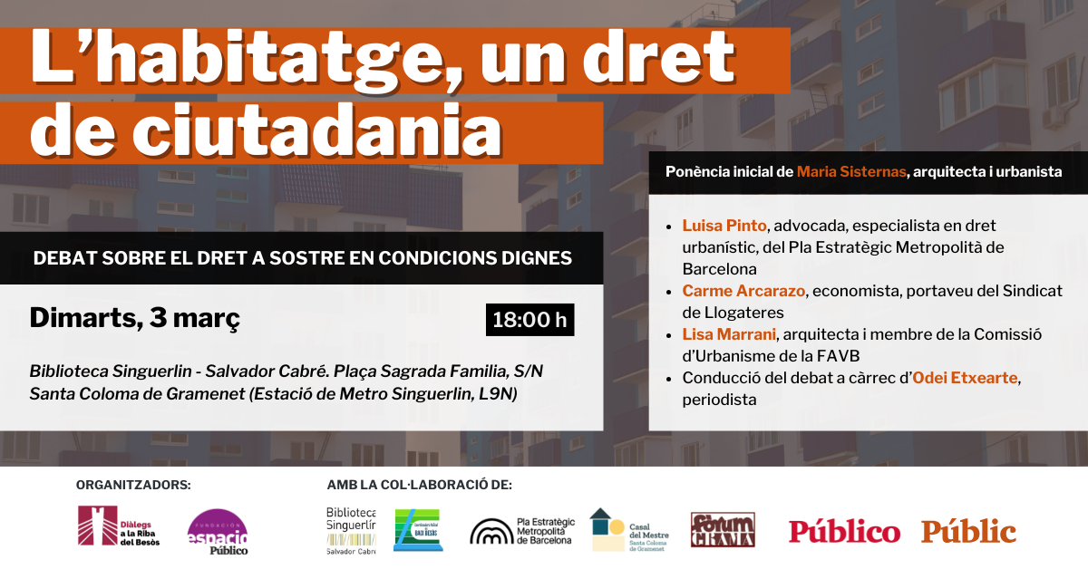 La Biblioteca Singuerlin acogió a las seis de la tarde un debate en colaboración con la entidad Diálogos en la Riba del Besòs. Participen: Maria Sisternas, Luisa Pinto, Carme Arcarazo, Lisa Marrani Conducció: Odei A.-Etxearte